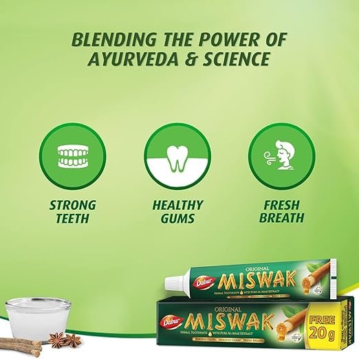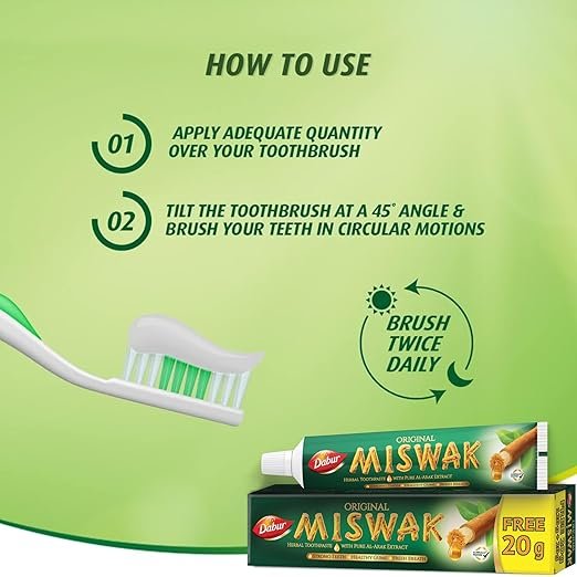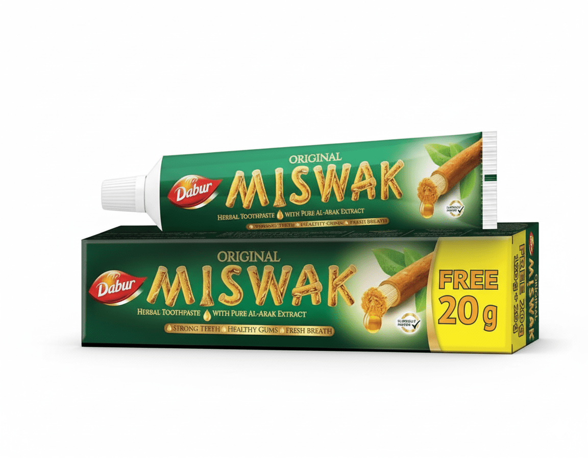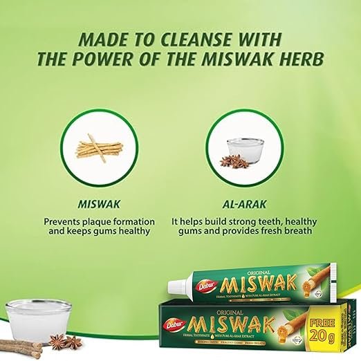 Dabur Miswak Herbal Fresh Toothpaste combines the ancient goodness of Al-Arak (Miswak) with modern herbal care for complete oral health. Formulated with pure Al-Arak extract, it helps fight germs, reduce tooth decay, and strengthen teeth and gums for a healthier, cleaner smile.