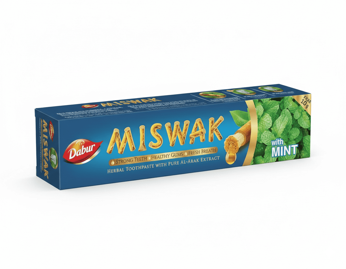 Discover natural oral care with Dabur Miswak Mint Toothpaste (120g + 20g Free) — powered by the time-tested goodness of Miswak (Al Arak) extract. This herbal toothpaste naturally cleans teeth, fights bacteria, and helps maintain healthy gums and fresh breath all day long.